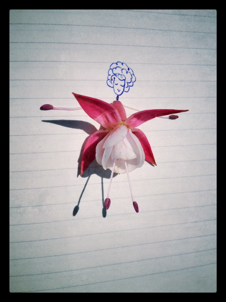 now this is adorable! i love her limbs from actual flower. maybe the drawing would look even better if done with pink/red pencil, but overall, really cool result. 🙂