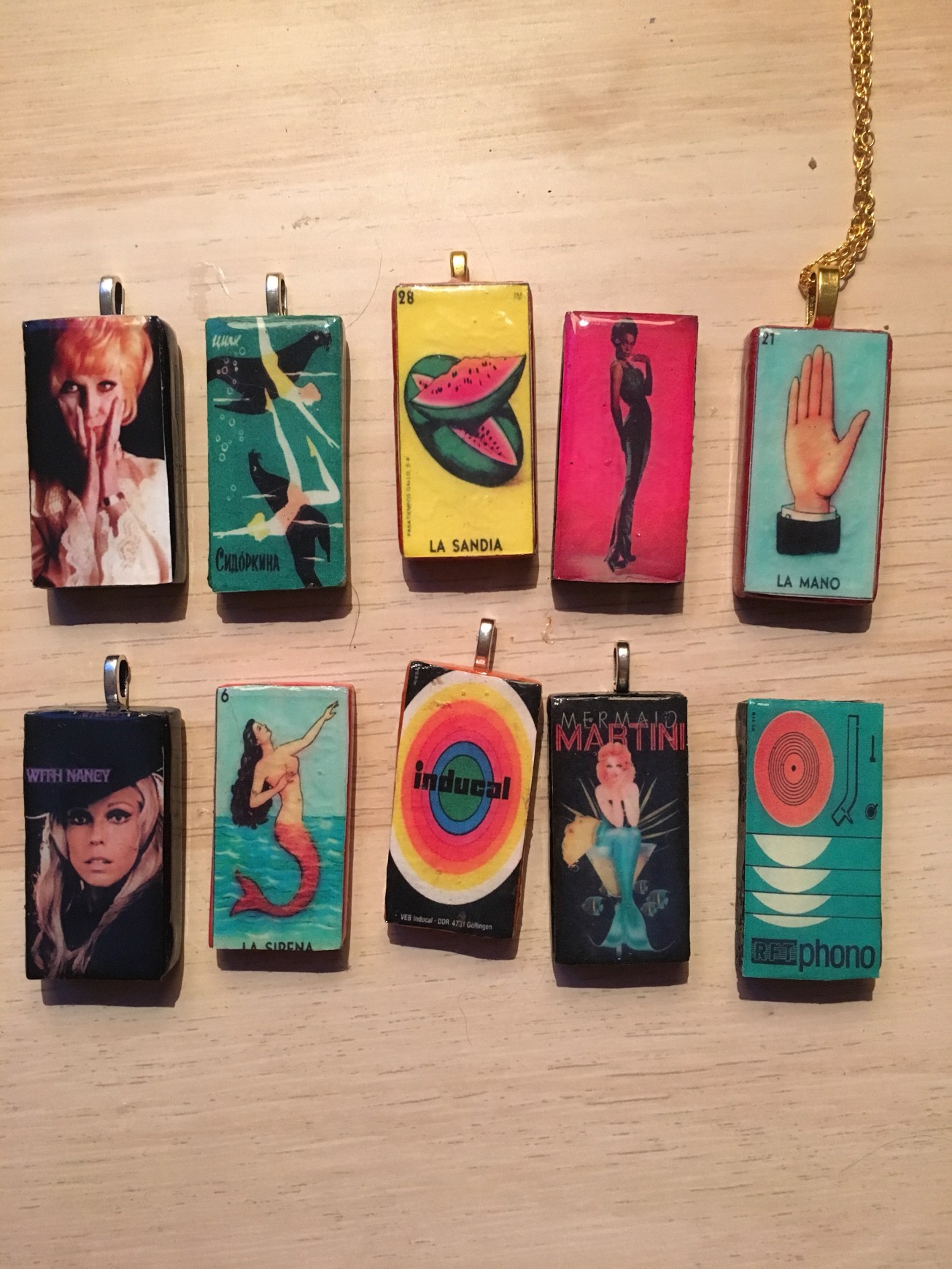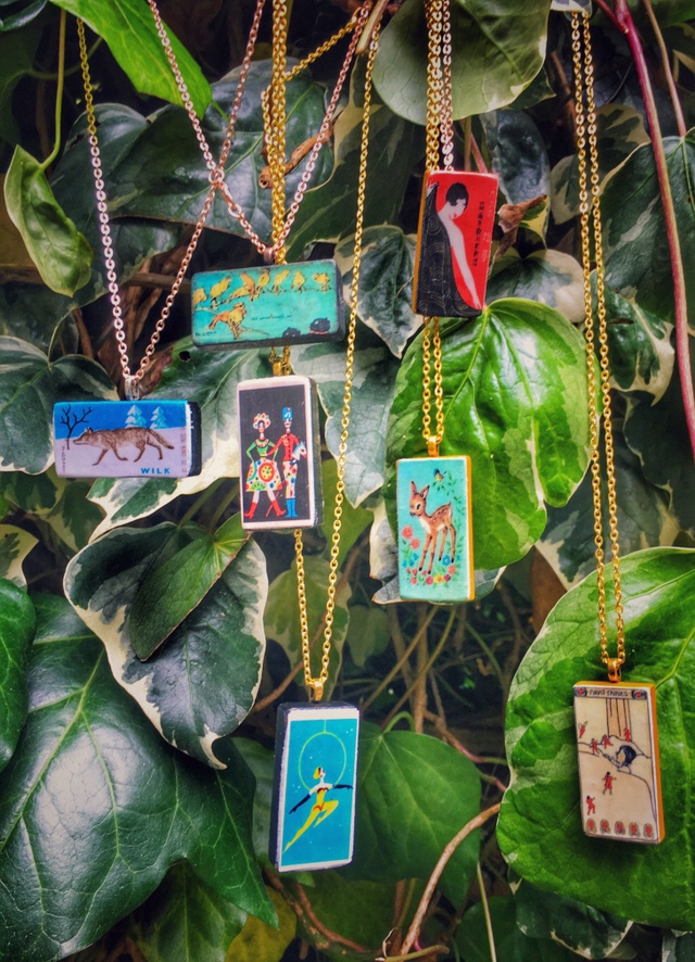 Art deco mermaids, vintage geishas and Japanese wine totting cats, soviet space dogs, Mexican lottery cards, east European memorabilia, favourite singers, bands and actors, the domino pendants decline all my passions in a few square centimetres.