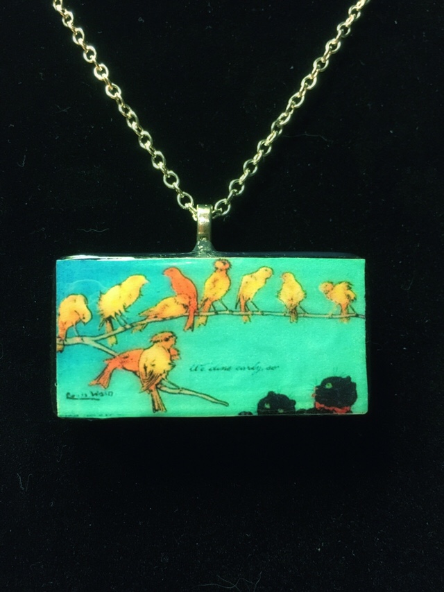 I bought my first pendant on Etsy, unsurprisingly, a good few years ago. It was an illustration by my favourite Victorian cat anthropomorphist (not sure how many there are!) Louis Wain, depicting a cat contemplating his potential dinner in the form of sweet little birdies in a tree.