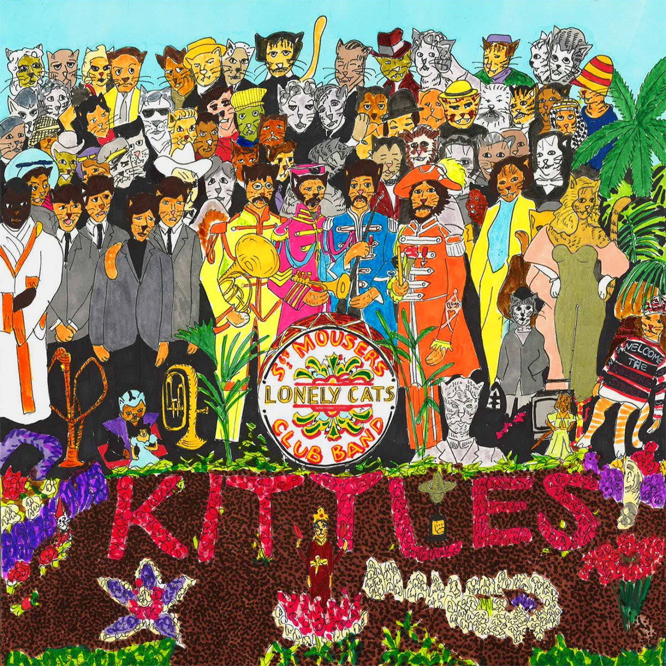 I started by copying in pencil the existing artwork, then catified each subject by slightly changing the features to be more cat-like, with ears, whiskers and tails.